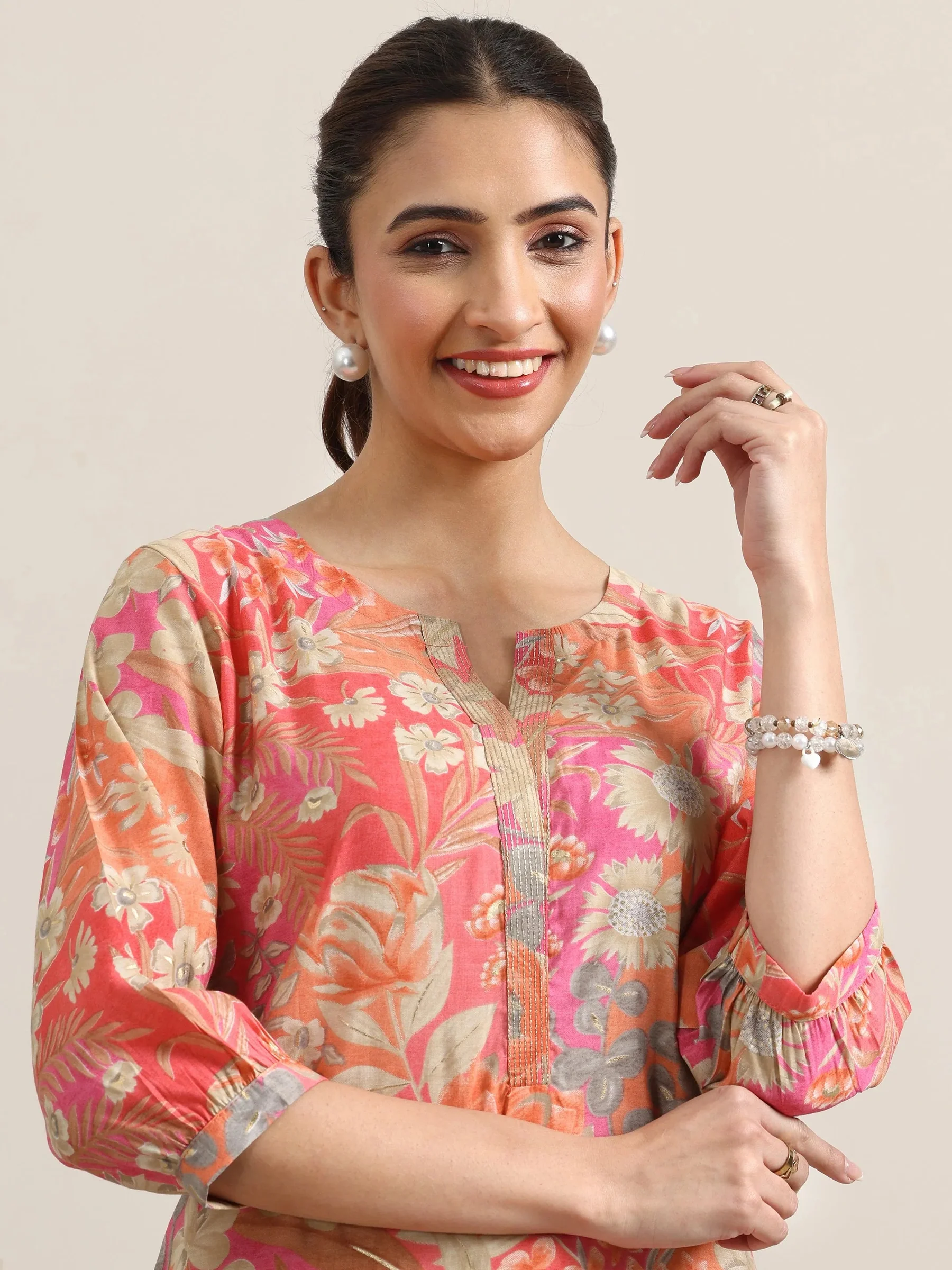 Peach Printed Silk Blend Straight Kurta